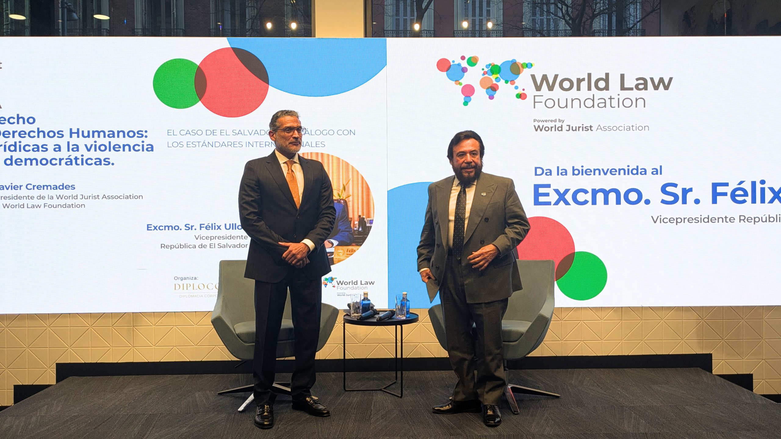 During the event, Vice President Ulloa detailed the historical evolution of the security situation in his country, describing the process of reclaiming territorial control. In a subsequent discussion moderated by Juan Carlos Gutiérrez, President of the Human Rights Institute of the World Jurist Association, the legal nature of the current state of exception in El Salvador was addressed. The dialogue focused on the democratic legitimacy of exceptional measures and their alignment with the theory of the government of laws, analyzing how these legal tools have impacted the protection of fundamental rights such as life and property.