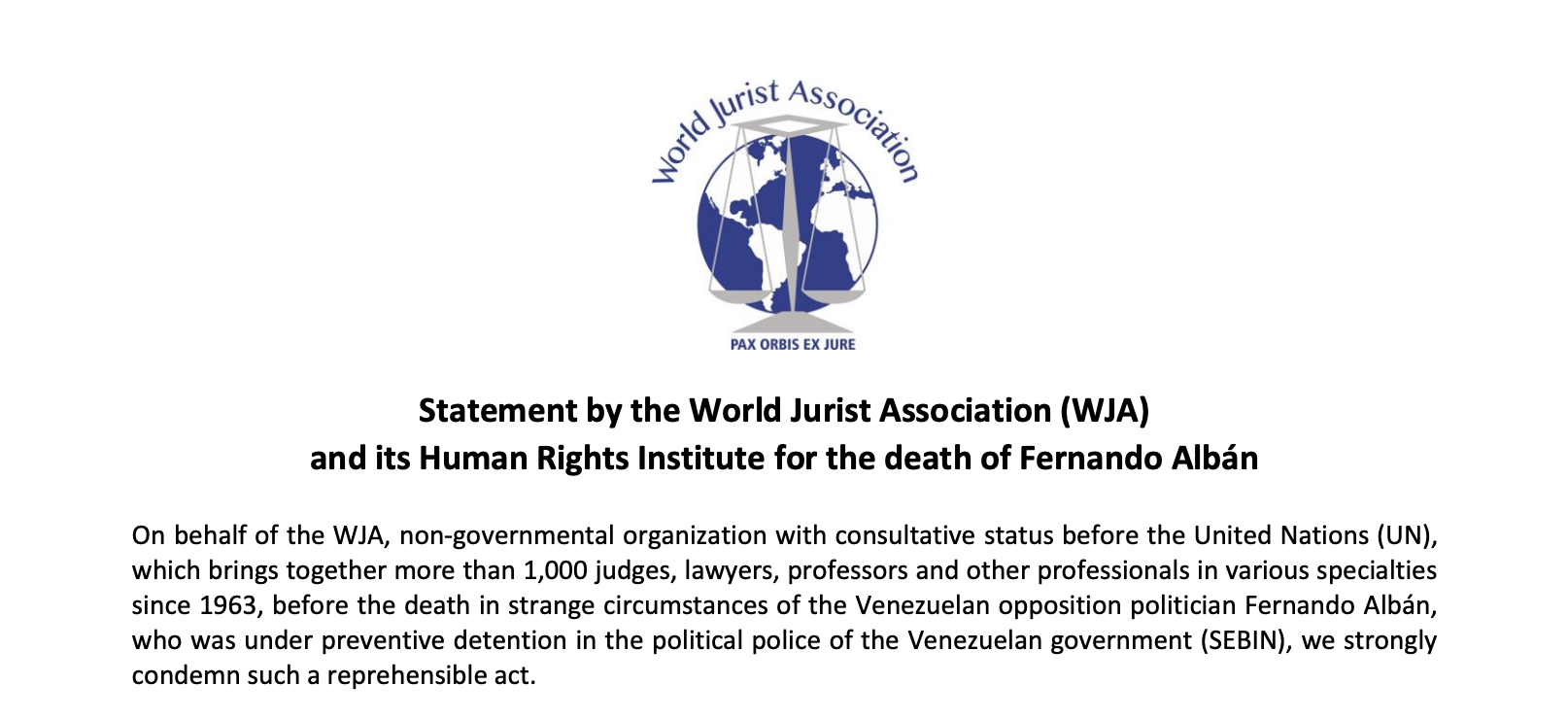 On behalf of the WJA, non-governmental organization with consultative status before the United Nations (UN), which brings together more than 1,000 judges, lawyers, professors and other professionals in various specialties since 1963, before the death in strange circumstances of the Venezuelan opposition politician Fernando Albán, who was under preventive detention in the political police of […]